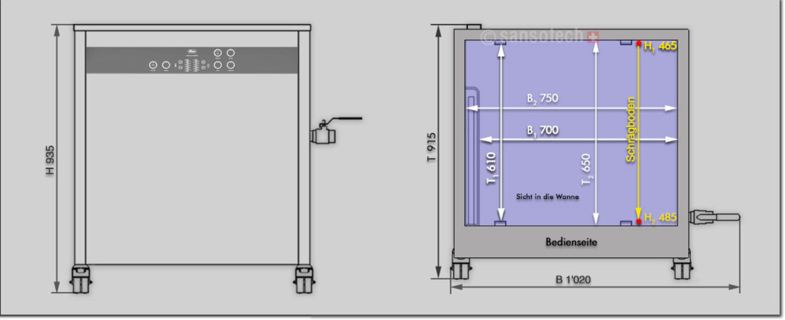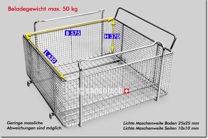 700 x 610 x 465/485 mm, mit Schrägboden zum besseren Entleeren