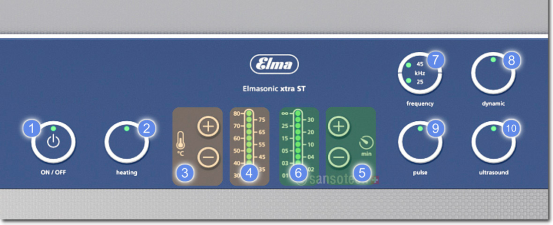 8 Taste dynamic: zur effektiven Reinigung durch gleichmässige Leistungsverteilung und Leistungserhöhung. Bei Aktivierung leuchtet die grüne LED im Tastenfeld. Die Funktion dynamic kann vor und während des Ultraschallbetriebs beliebig ein- oder ausgeschaltet werden.