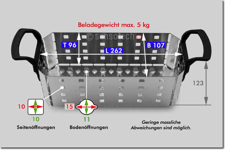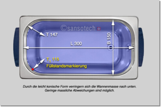 Innenmasse Wanne Länge x Breite x Tiefe ca. | 300 x 150 x 147 mm, oben am Rand gemessen |